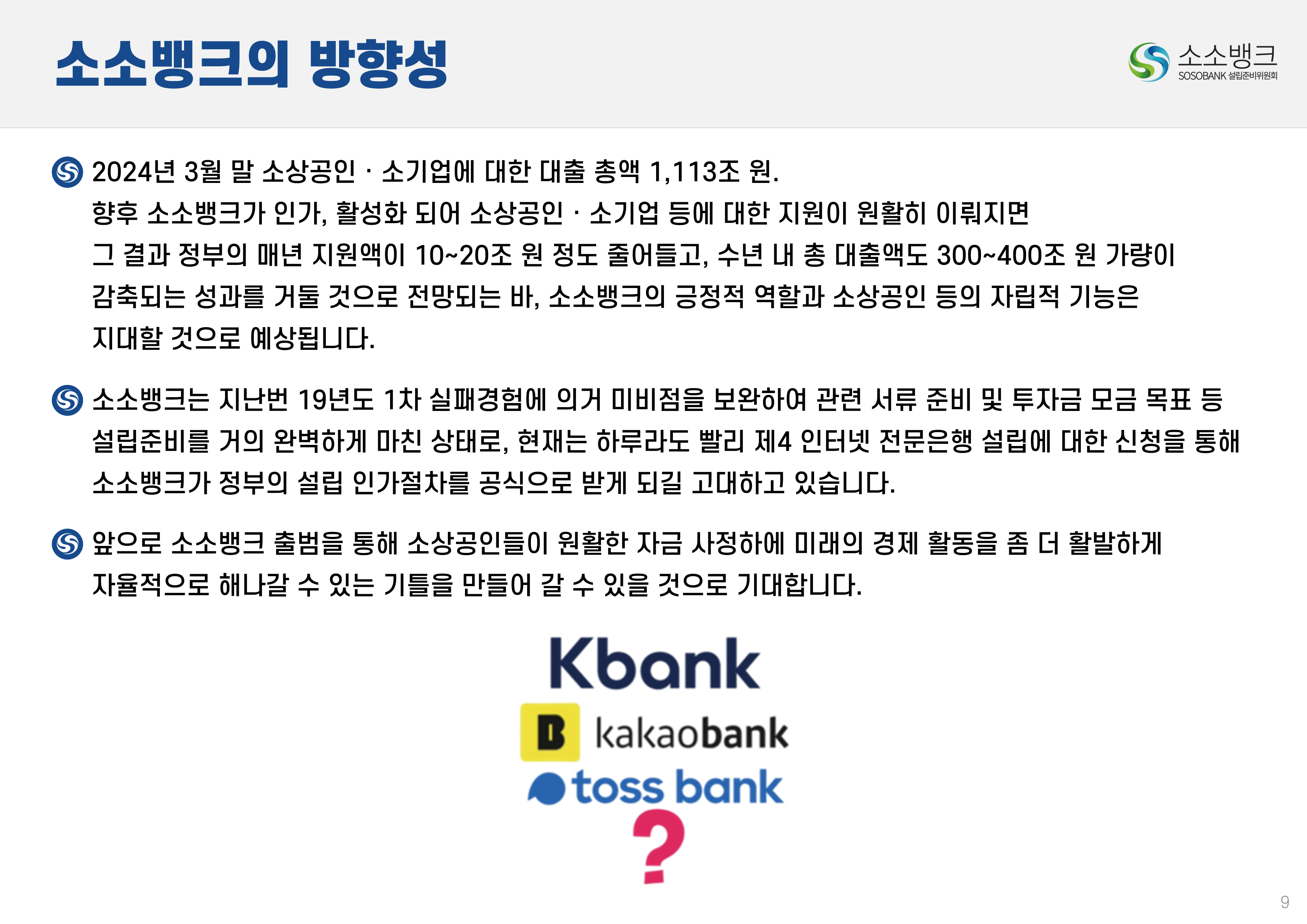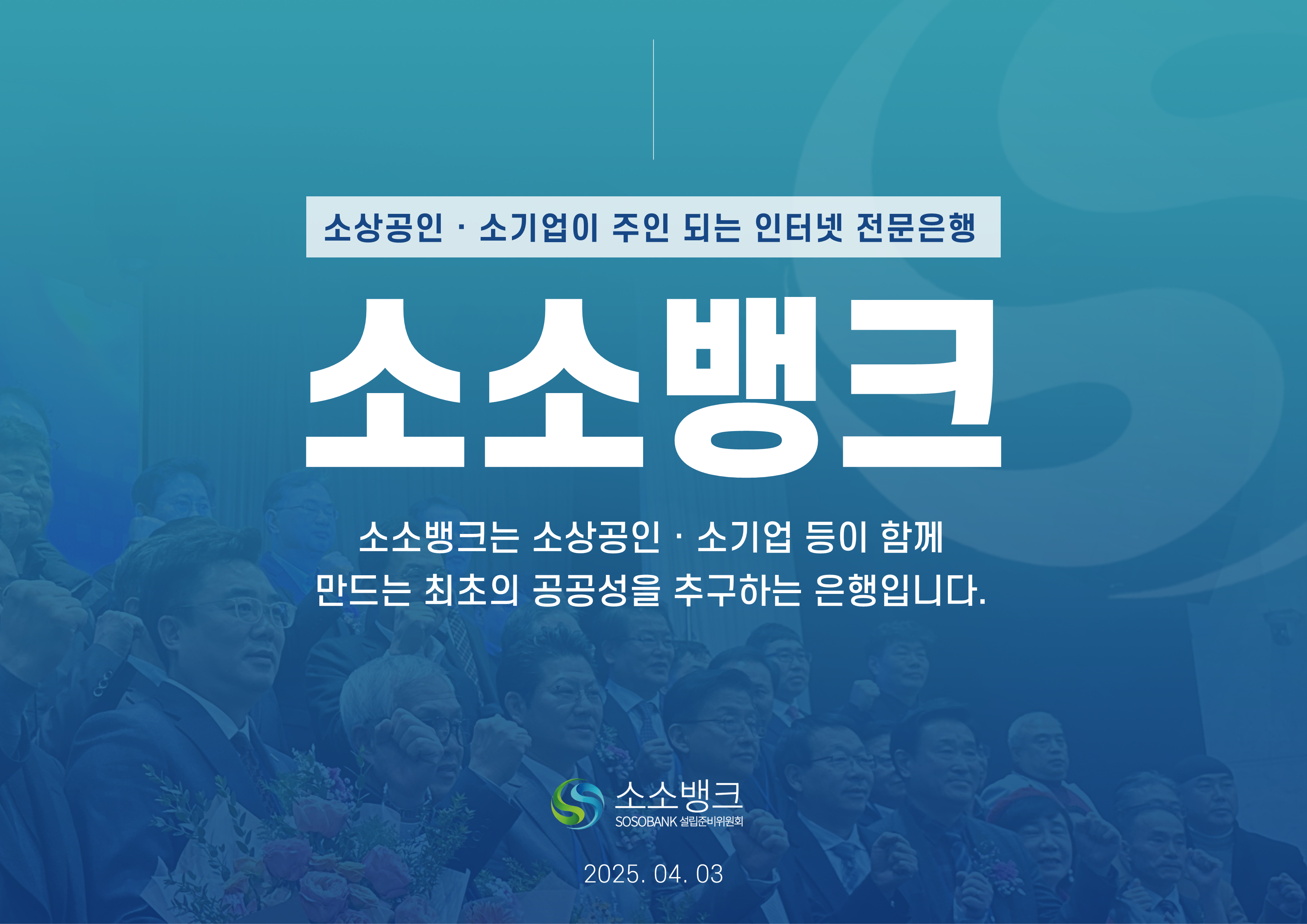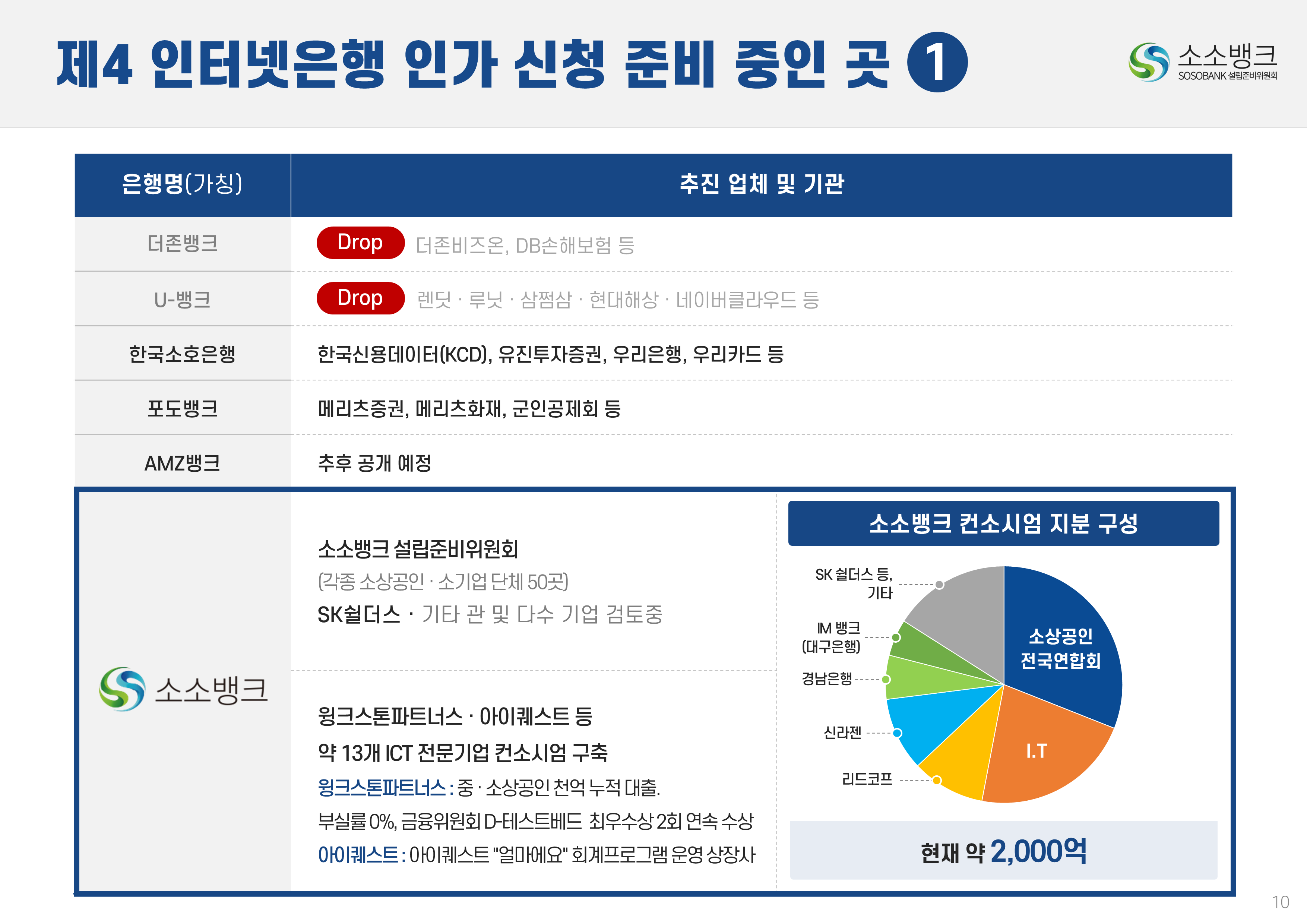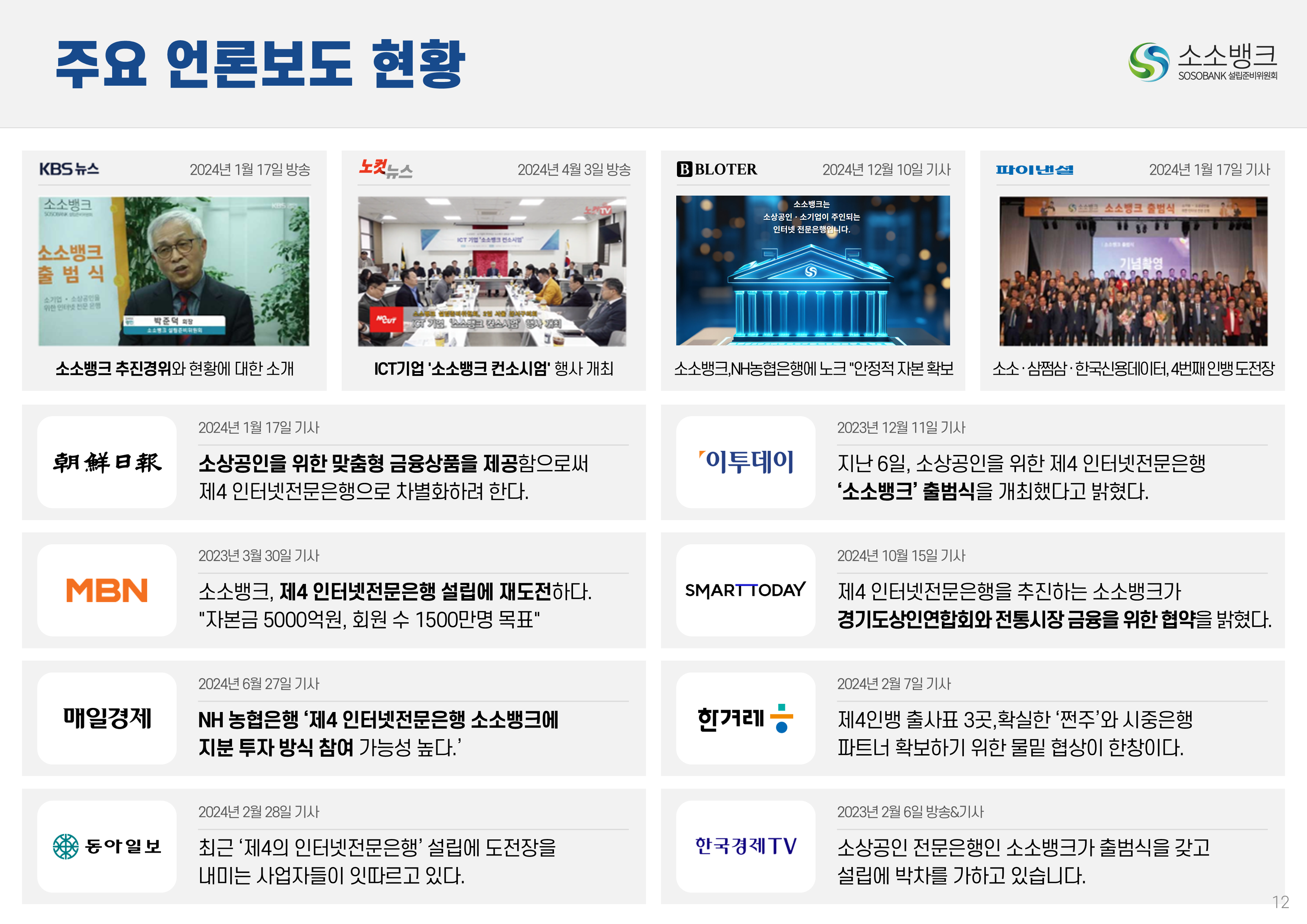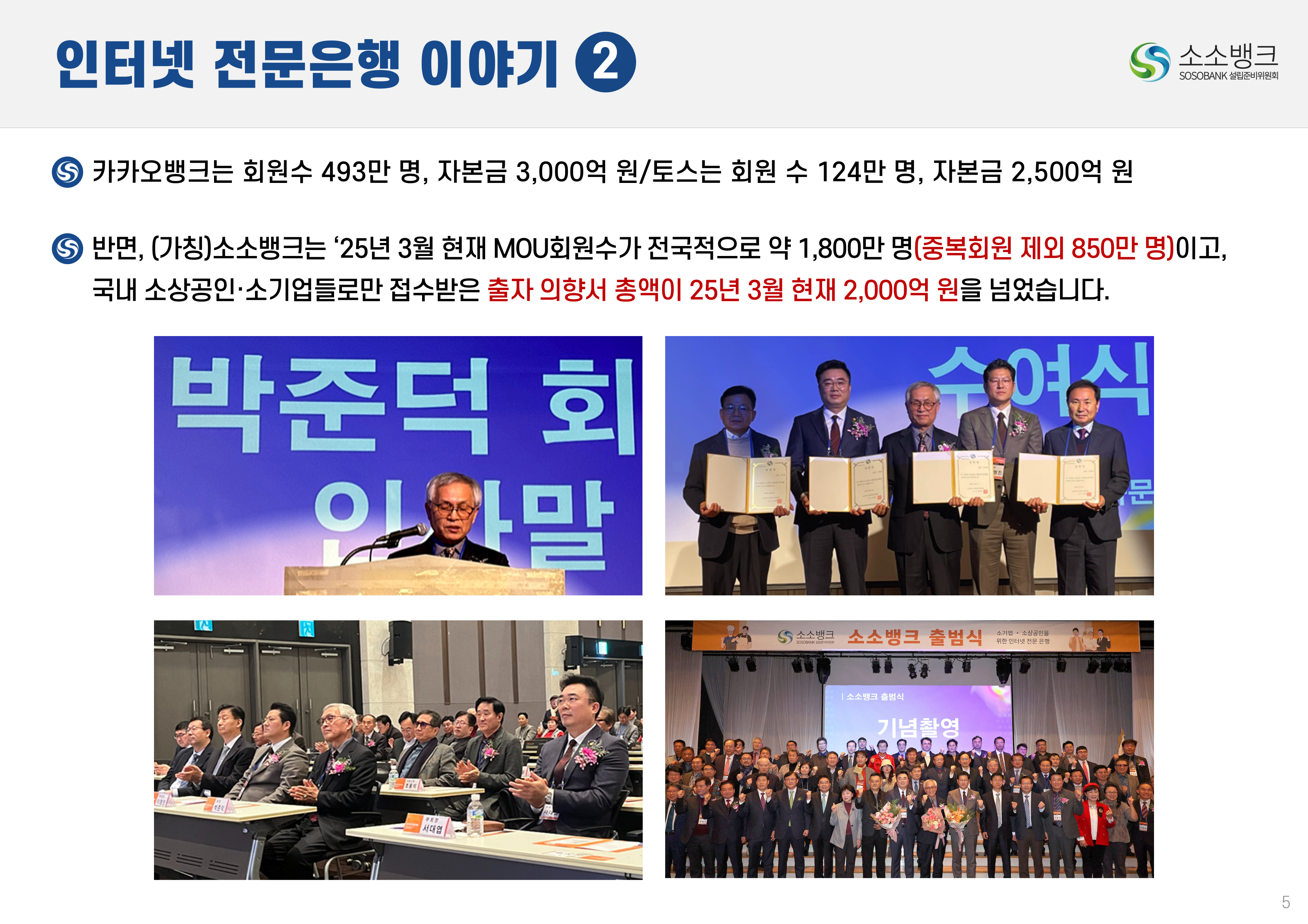 소소뱅크는 소상공인ㆍ소기업이 주인되는 인터넷 전문은행입니다. MOU 회원수 약 만명 MOU 회원수 약 만명 현재 자본금 납입의향 금액 합계 위 금액은 순수하게 소상공인ㆍ소기업에서만 받은 금액 합산입니다. 자본금 납입 의향서 접수 완료 되었습니다 보도자료 1코노미뉴스 2025-10-24 소소뱅크, 제4인뱅 불씨 살릴까...시중은행 접촉 등 재정비 박차 머니투데이 2025-10-20 이억원 "새로운 형태 은행 필요성 인정…시장상황 따라 검토" 시사저널e. 2025-09-29 금융당국 조직개편 백지화에···제4인터넷은행 재추진 기대감 뉴스웨이 2025-09-26 제4인뱅 재추진 소소뱅크,이테크시스템 수혈로 자본 경쟁력 강화 파이낸셜 2025-09-26 이테크시스템, '제4 인터넷전문은행 재추진'소소뱅크 컨소시엄에 대주주 운영사로 합류 지디넷코리아 2025-09-26 '구원투수' 이테크시스템 등판…소소뱅크,제4인뱅 탈락 9일 만에 재도전 MTN 뉴스 2025-09-19 제4 인터넷전문은행 불허…소소뱅크"멈추지 않고 다시 도전" 뉴스원 2025-09-18 소상공인계 "제4인뱅 예비인가 무산 유감…재추진해야" 뉴스원 2025-07-23 '소상공인 특화은행' 강조한 李…새 정권 찬스?'소소뱅크' 다시 뛴다 파이낸스투데이 2025-07-20 전국상인연합회–소소뱅크,소상공인 맞춤형 금융 위해 손잡다 연합뉴스 2025-07-01 소상공인연합회 "제4인뱅,소상공인 중심으로 설립돼야" 한국경제 2025-03-27 소소뱅크에 경남은행 합류…제4 인뱅'혼전'"안정적 자본 확보" 블로터 2025-03-27 제4인뱅 '4파전'…예비인가 결과는6월 발표"안정적 자본 확보" 스마트투데이 2024-10-15 소소뱅크 설립준비위,경기도상인연합회와 맞손 SBS Biz 2024-10-10 김병환 "인뱅 '신규 인가' 진행…공매도 시스템, 원활 구축" 한국경제 2024-09-13 "제4 인뱅 기준, 11월까지 마련" 뉴스원 2024-07-22 김병환 금융위원장 ‘하반기 중제4인터넷은행 선정 절차 진행’ 시사오늘 2024-09-06 “인뱅도 은행”…전통금융 참여없는소소뱅크 제4인뱅 경쟁력 있을까 파이낸셜 2024-07-19 ‘김한길 금융통합위원장 소상공인 지원’제4인터넷은행 설립 제안 매일경제 2024-06-27 NH 농협은행 '소소뱅크에지분 투자 방식 참여 가능성 높다.' SBS Biz 2024-05-13 국민통합위, 尹에 소상공인 인터넷 은행·폐교부지기숙사 설립 제안 노컷뉴스 2024-04-03 소소뱅크 컨소시엄,ICT 기업11개사 참여 확정 한국금융 2024-03-04 소소뱅크, 소상공인 대출 최대 400조 흡수 목표 아시아타임즈 2024-02-24 [아하인터뷰] "소상공인‧소기업이주인인 은행될 것 " MOU 협약단체들 ㆍ소상공인연합회ㆍ전국 상인연합회ㆍ강원도 소상공인연합회ㆍ경상남도 소상공인연합회ㆍ경상북도 소상공인연합회ㆍ충청남도 소상공인연합회ㆍ부산광역시 소상공인연합회ㆍ대구광역시 소상공인연합회ㆍ전라남도 소상공인연합회ㆍ충청북도 소상공인연합회ㆍ전라북도 소상공인연합회ㆍ제주특별자치도 소상공인연합회ㆍ경기도 소상공인연합회ㆍ서울시 소기업소상공인연합회ㆍ경기도 소기업소상공인연합회 ㆍ한국소공인협회ㆍ자영업소상공인중앙회ㆍ세계한인여성회장협의회ㆍ한국장애인단체총연합회ㆍ한국지체장애인협회ㆍ퍼시픽코리아ㆍ전국패션소상공인연합회ㆍ울산 현대기아차 협력사협의회ㆍ신원리조트ㆍ대한미용사회 전남동부지회ㆍ직능단체연합ㆍ재난극복범국민협의회ㆍ한국여성문화생활회ㆍCBS M&C ㆍ서울경제연합ㆍ대한민국여경재향경우회ㆍ사회적협동조합연합회 중앙회ㆍ청년창업가협회ㆍ한국불교 태고종 신도회ㆍ한국스마트휴먼테크협회ㆍ전국직장인다문화축구협회ㆍ한국중소벤처디지털혁신협회ㆍ전국동포총연합회ㆍ한국경영기술지도사회ㆍ천하제일 광개토부대 육군 제1군단ㆍ한국원가관리협회ㆍ한국종합경제 연구원 소소뱅크는