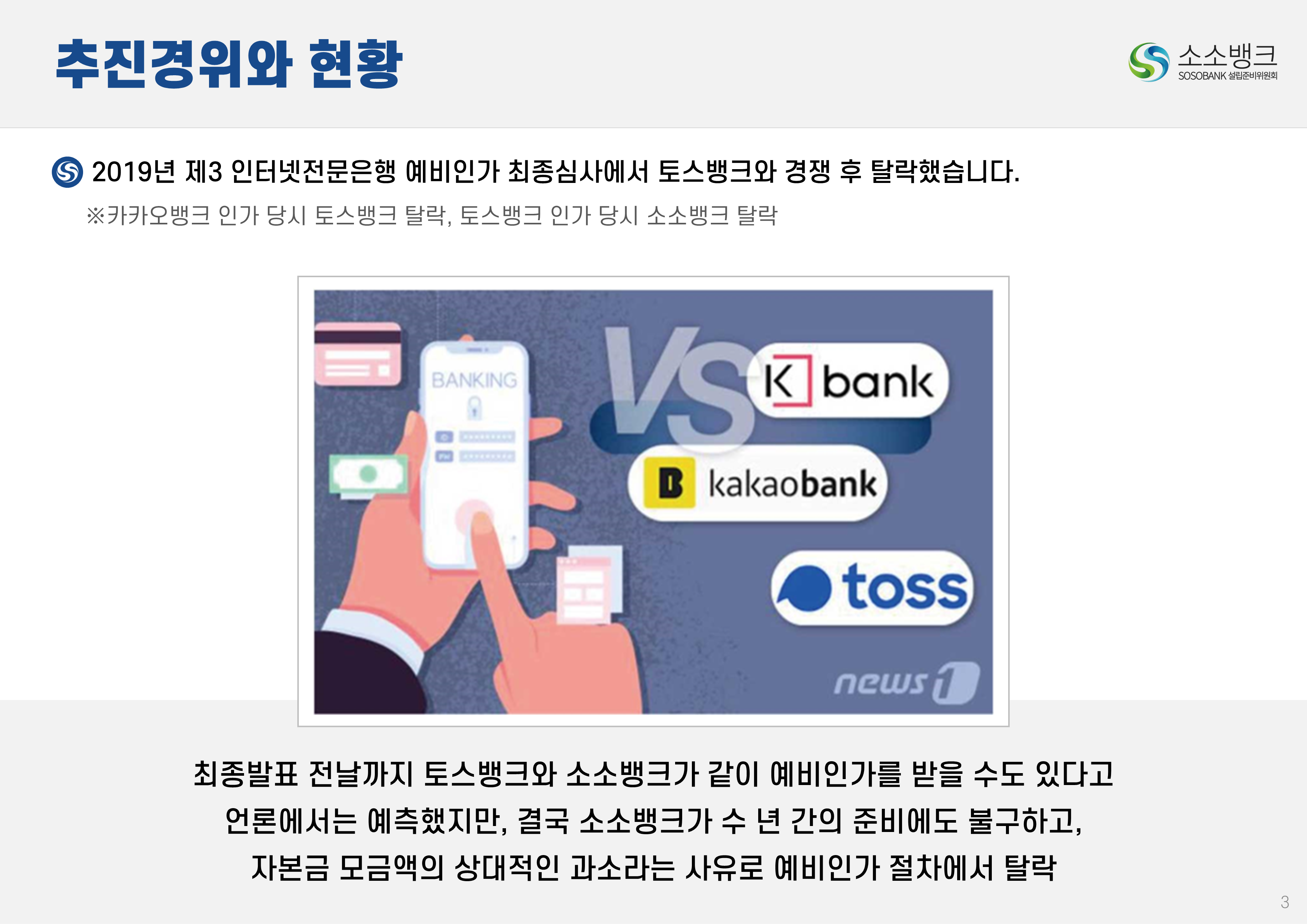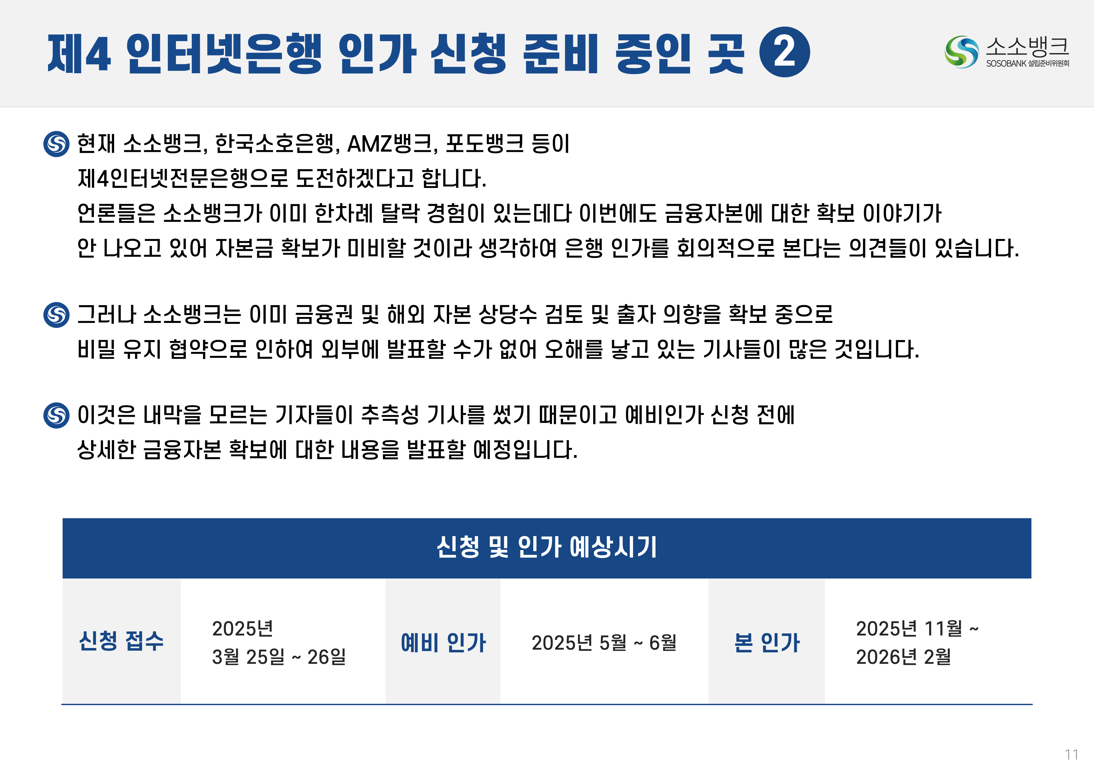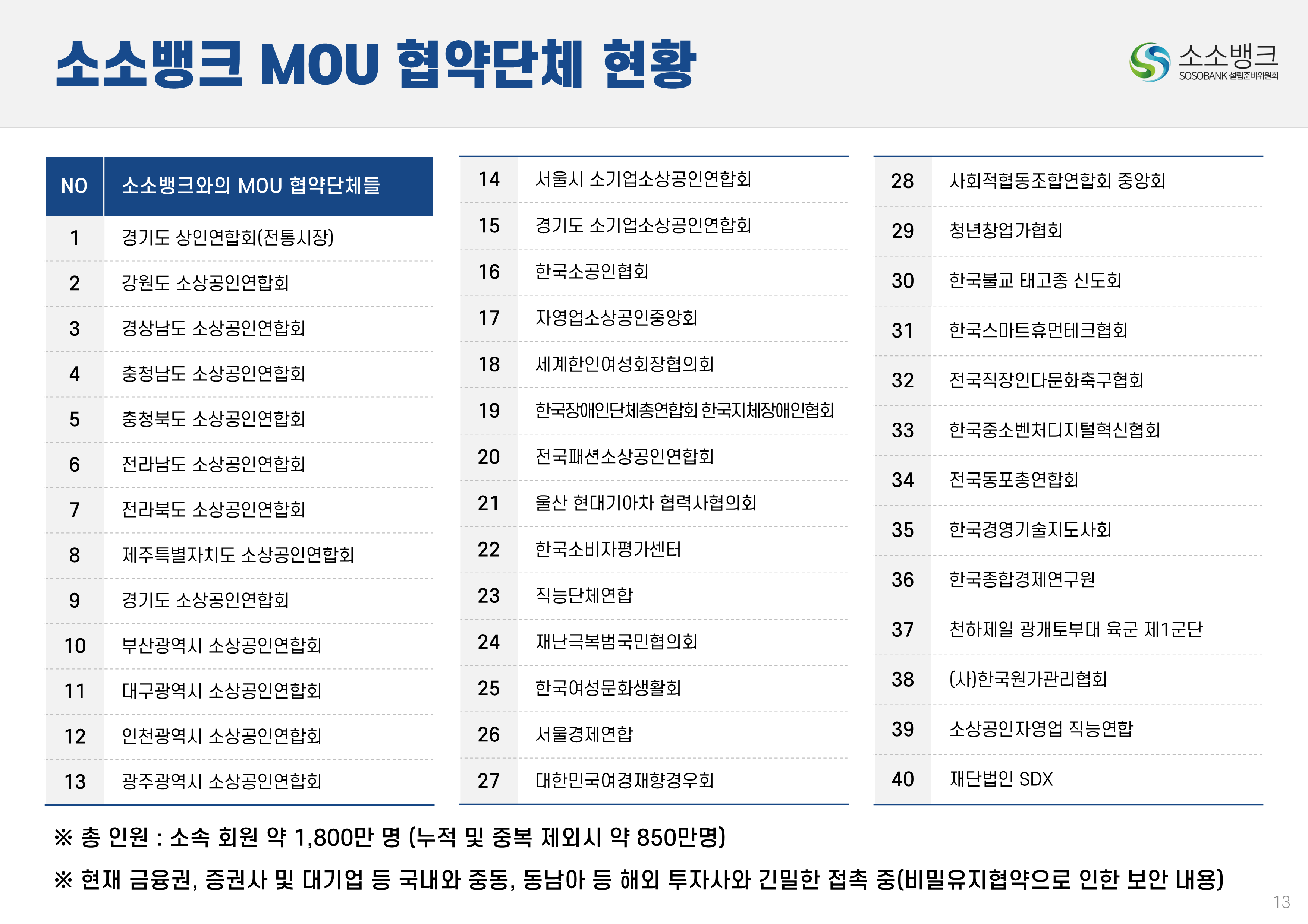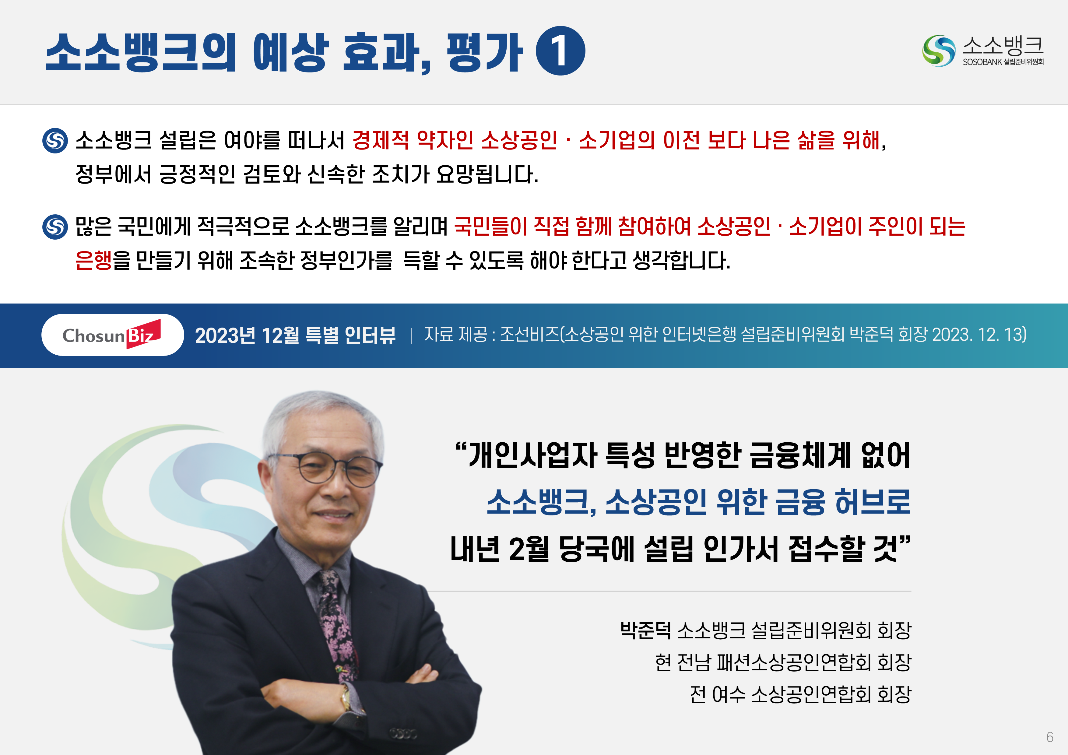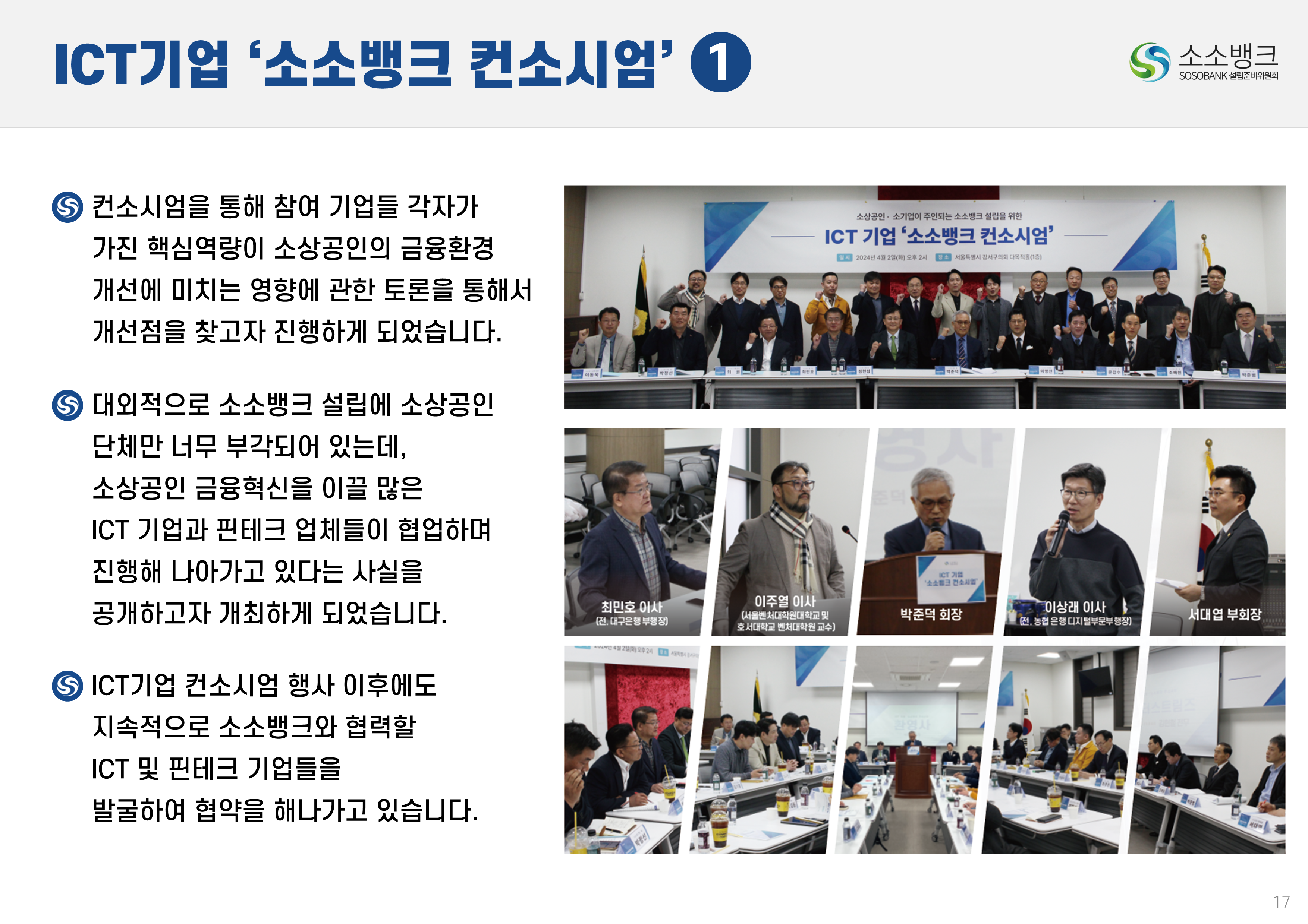 소소뱅크는 소상공인ㆍ소기업이 주인되는 인터넷 전문은행입니다. MOU 회원수 약 만명 MOU 회원수 약 만명 현재 자본금 납입의향 금액 합계 위 금액은 순수하게 소상공인ㆍ소기업에서만 받은 금액 합산입니다. 자본금 납입 의향서 접수 완료 되었습니다 보도자료 1코노미뉴스 2025-10-24 소소뱅크, 제4인뱅 불씨 살릴까...시중은행 접촉 등 재정비 박차 머니투데이 2025-10-20 이억원 "새로운 형태 은행 필요성 인정…시장상황 따라 검토" 시사저널e. 2025-09-29 금융당국 조직개편 백지화에···제4인터넷은행 재추진 기대감 뉴스웨이 2025-09-26 제4인뱅 재추진 소소뱅크,이테크시스템 수혈로 자본 경쟁력 강화 파이낸셜 2025-09-26 이테크시스템, '제4 인터넷전문은행 재추진'소소뱅크 컨소시엄에 대주주 운영사로 합류 지디넷코리아 2025-09-26 '구원투수' 이테크시스템 등판…소소뱅크,제4인뱅 탈락 9일 만에 재도전 MTN 뉴스 2025-09-19 제4 인터넷전문은행 불허…소소뱅크"멈추지 않고 다시 도전" 뉴스원 2025-09-18 소상공인계 "제4인뱅 예비인가 무산 유감…재추진해야" 뉴스원 2025-07-23 '소상공인 특화은행' 강조한 李…새 정권 찬스?'소소뱅크' 다시 뛴다 파이낸스투데이 2025-07-20 전국상인연합회–소소뱅크,소상공인 맞춤형 금융 위해 손잡다 연합뉴스 2025-07-01 소상공인연합회 "제4인뱅,소상공인 중심으로 설립돼야" 한국경제 2025-03-27 소소뱅크에 경남은행 합류…제4 인뱅'혼전'"안정적 자본 확보" 블로터 2025-03-27 제4인뱅 '4파전'…예비인가 결과는6월 발표"안정적 자본 확보" 스마트투데이 2024-10-15 소소뱅크 설립준비위,경기도상인연합회와 맞손 SBS Biz 2024-10-10 김병환 "인뱅 '신규 인가' 진행…공매도 시스템, 원활 구축" 한국경제 2024-09-13 "제4 인뱅 기준, 11월까지 마련" 뉴스원 2024-07-22 김병환 금융위원장 ‘하반기 중제4인터넷은행 선정 절차 진행’ 시사오늘 2024-09-06 “인뱅도 은행”…전통금융 참여없는소소뱅크 제4인뱅 경쟁력 있을까 파이낸셜 2024-07-19 ‘김한길 금융통합위원장 소상공인 지원’제4인터넷은행 설립 제안 매일경제 2024-06-27 NH 농협은행 '소소뱅크에지분 투자 방식 참여 가능성 높다.' SBS Biz 2024-05-13 국민통합위, 尹에 소상공인 인터넷 은행·폐교부지기숙사 설립 제안 노컷뉴스 2024-04-03 소소뱅크 컨소시엄,ICT 기업11개사 참여 확정 한국금융 2024-03-04 소소뱅크, 소상공인 대출 최대 400조 흡수 목표 아시아타임즈 2024-02-24 [아하인터뷰] "소상공인‧소기업이주인인 은행될 것 " MOU 협약단체들 ㆍ소상공인연합회ㆍ전국 상인연합회ㆍ강원도 소상공인연합회ㆍ경상남도 소상공인연합회ㆍ경상북도 소상공인연합회ㆍ충청남도 소상공인연합회ㆍ부산광역시 소상공인연합회ㆍ대구광역시 소상공인연합회ㆍ전라남도 소상공인연합회ㆍ충청북도 소상공인연합회ㆍ전라북도 소상공인연합회ㆍ제주특별자치도 소상공인연합회ㆍ경기도 소상공인연합회ㆍ서울시 소기업소상공인연합회ㆍ경기도 소기업소상공인연합회 ㆍ한국소공인협회ㆍ자영업소상공인중앙회ㆍ세계한인여성회장협의회ㆍ한국장애인단체총연합회ㆍ한국지체장애인협회ㆍ퍼시픽코리아ㆍ전국패션소상공인연합회ㆍ울산 현대기아차 협력사협의회ㆍ신원리조트ㆍ대한미용사회 전남동부지회ㆍ직능단체연합ㆍ재난극복범국민협의회ㆍ한국여성문화생활회ㆍCBS M&C ㆍ서울경제연합ㆍ대한민국여경재향경우회ㆍ사회적협동조합연합회 중앙회ㆍ청년창업가협회ㆍ한국불교 태고종 신도회ㆍ한국스마트휴먼테크협회ㆍ전국직장인다문화축구협회ㆍ한국중소벤처디지털혁신협회ㆍ전국동포총연합회ㆍ한국경영기술지도사회ㆍ천하제일 광개토부대 육군 제1군단ㆍ한국원가관리협회ㆍ한국종합경제 연구원 소소뱅크는