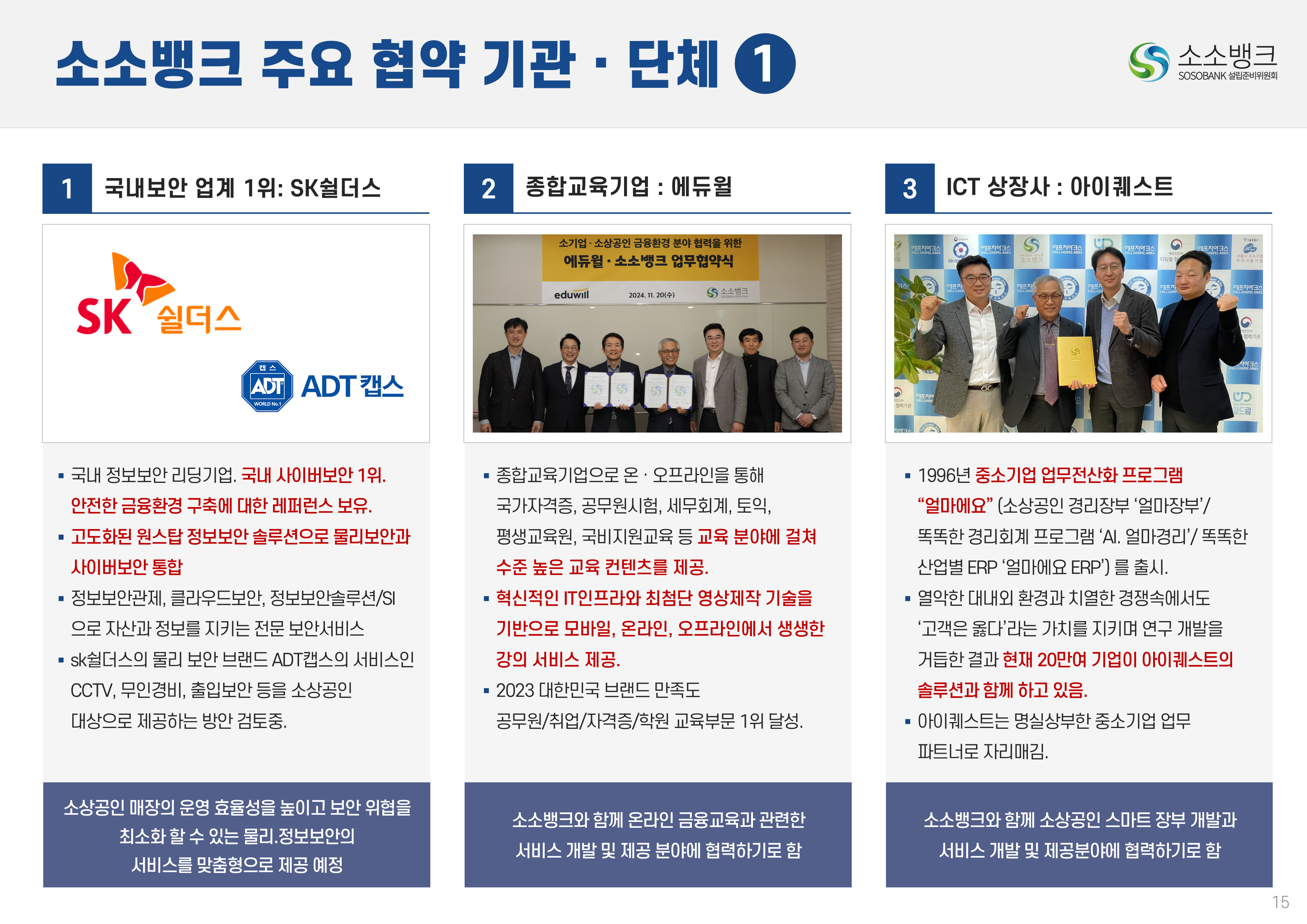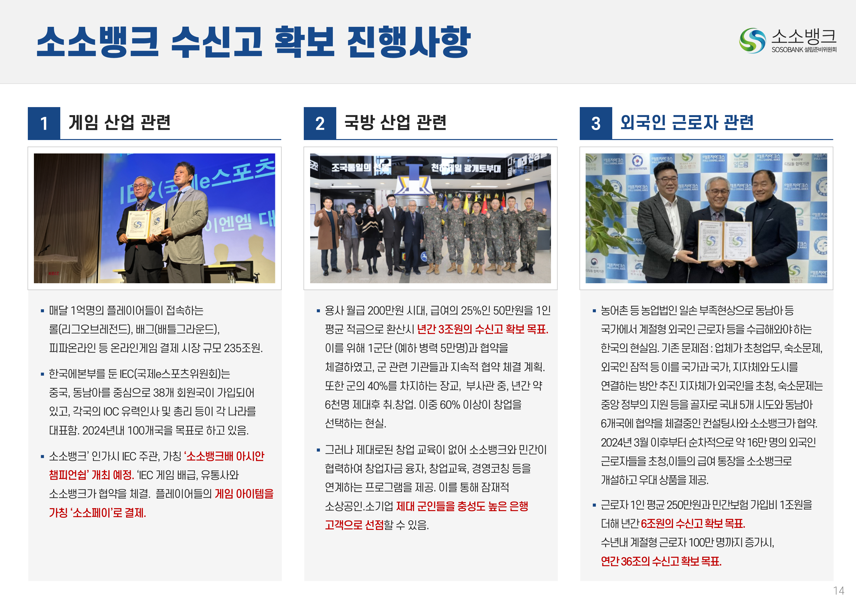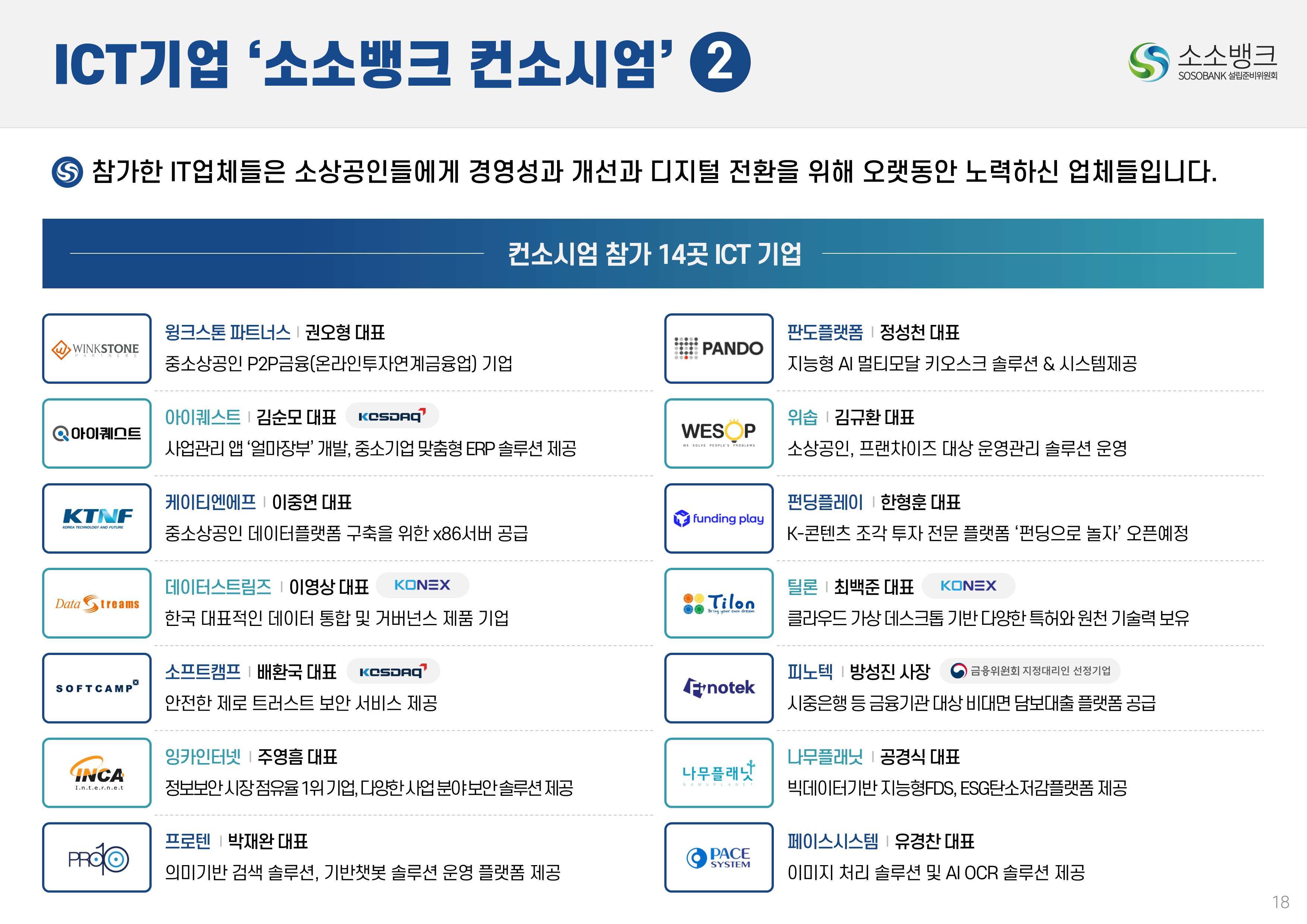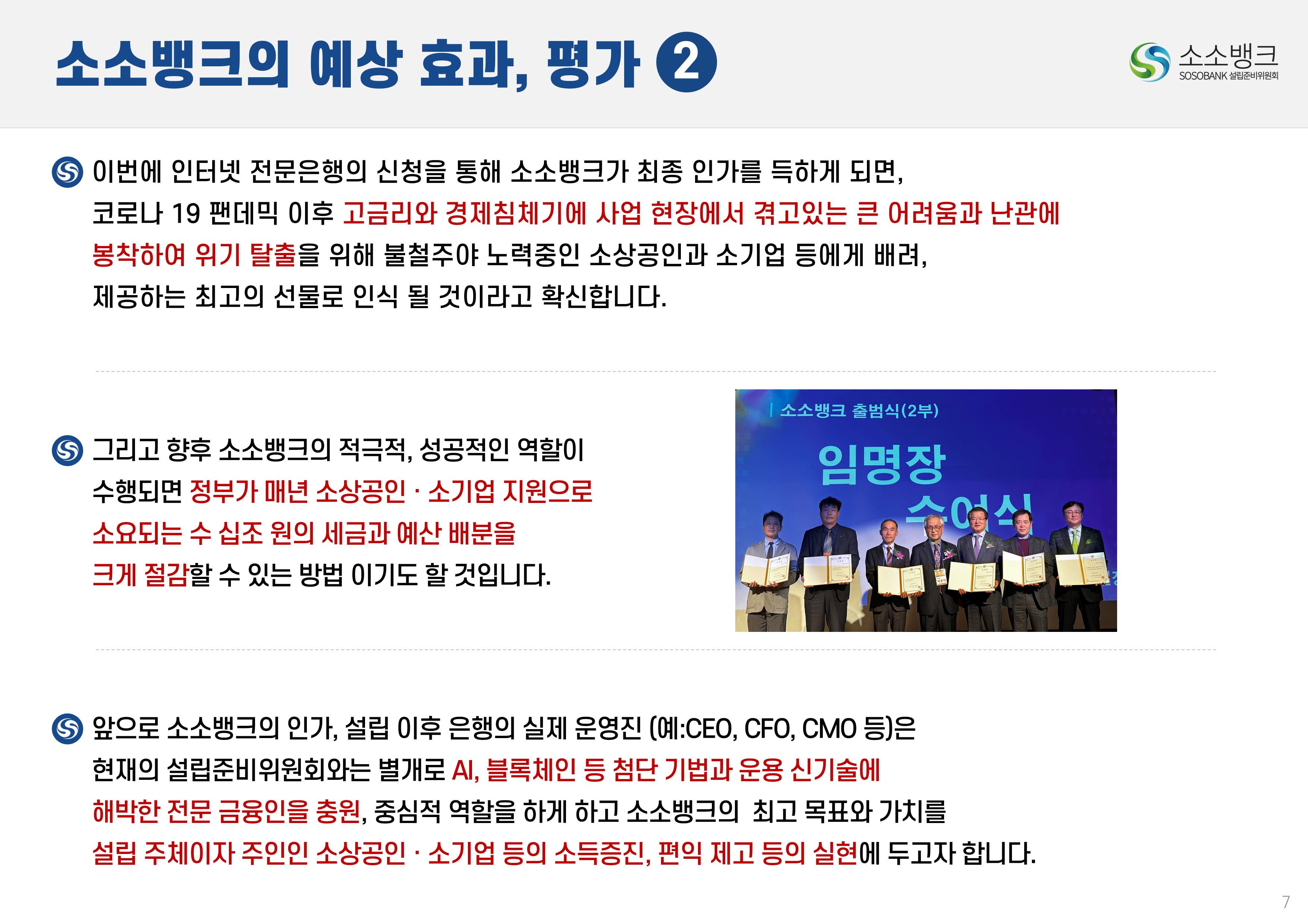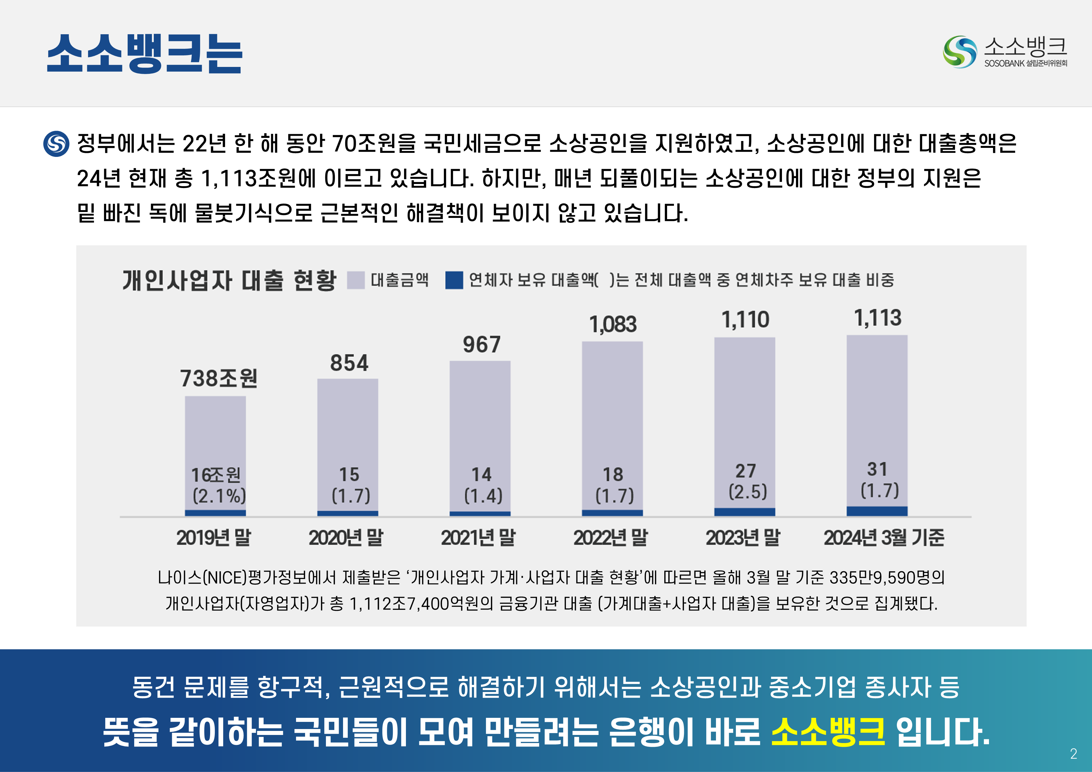 소소뱅크는 소상공인ㆍ소기업이 주인되는 인터넷 전문은행입니다. MOU 회원수 약 만명 MOU 회원수 약 만명 현재 자본금 납입의향 금액 합계 위 금액은 순수하게 소상공인ㆍ소기업에서만 받은 금액 합산입니다. 자본금 납입 의향서 접수 완료 되었습니다 보도자료 1코노미뉴스 2025-10-24 소소뱅크, 제4인뱅 불씨 살릴까...시중은행 접촉 등 재정비 박차 머니투데이 2025-10-20 이억원 "새로운 형태 은행 필요성 인정…시장상황 따라 검토" 시사저널e. 2025-09-29 금융당국 조직개편 백지화에···제4인터넷은행 재추진 기대감 뉴스웨이 2025-09-26 제4인뱅 재추진 소소뱅크,이테크시스템 수혈로 자본 경쟁력 강화 파이낸셜 2025-09-26 이테크시스템, '제4 인터넷전문은행 재추진'소소뱅크 컨소시엄에 대주주 운영사로 합류 지디넷코리아 2025-09-26 '구원투수' 이테크시스템 등판…소소뱅크,제4인뱅 탈락 9일 만에 재도전 MTN 뉴스 2025-09-19 제4 인터넷전문은행 불허…소소뱅크"멈추지 않고 다시 도전" 뉴스원 2025-09-18 소상공인계 "제4인뱅 예비인가 무산 유감…재추진해야" 뉴스원 2025-07-23 '소상공인 특화은행' 강조한 李…새 정권 찬스?'소소뱅크' 다시 뛴다 파이낸스투데이 2025-07-20 전국상인연합회–소소뱅크,소상공인 맞춤형 금융 위해 손잡다 연합뉴스 2025-07-01 소상공인연합회 "제4인뱅,소상공인 중심으로 설립돼야" 한국경제 2025-03-27 소소뱅크에 경남은행 합류…제4 인뱅'혼전'"안정적 자본 확보" 블로터 2025-03-27 제4인뱅 '4파전'…예비인가 결과는6월 발표"안정적 자본 확보" 스마트투데이 2024-10-15 소소뱅크 설립준비위,경기도상인연합회와 맞손 SBS Biz 2024-10-10 김병환 "인뱅 '신규 인가' 진행…공매도 시스템, 원활 구축" 한국경제 2024-09-13 "제4 인뱅 기준, 11월까지 마련" 뉴스원 2024-07-22 김병환 금융위원장 ‘하반기 중제4인터넷은행 선정 절차 진행’ 시사오늘 2024-09-06 “인뱅도 은행”…전통금융 참여없는소소뱅크 제4인뱅 경쟁력 있을까 파이낸셜 2024-07-19 ‘김한길 금융통합위원장 소상공인 지원’제4인터넷은행 설립 제안 매일경제 2024-06-27 NH 농협은행 '소소뱅크에지분 투자 방식 참여 가능성 높다.' SBS Biz 2024-05-13 국민통합위, 尹에 소상공인 인터넷 은행·폐교부지기숙사 설립 제안 노컷뉴스 2024-04-03 소소뱅크 컨소시엄,ICT 기업11개사 참여 확정 한국금융 2024-03-04 소소뱅크, 소상공인 대출 최대 400조 흡수 목표 아시아타임즈 2024-02-24 [아하인터뷰] "소상공인‧소기업이주인인 은행될 것 " MOU 협약단체들 ㆍ소상공인연합회ㆍ전국 상인연합회ㆍ강원도 소상공인연합회ㆍ경상남도 소상공인연합회ㆍ경상북도 소상공인연합회ㆍ충청남도 소상공인연합회ㆍ부산광역시 소상공인연합회ㆍ대구광역시 소상공인연합회ㆍ전라남도 소상공인연합회ㆍ충청북도 소상공인연합회ㆍ전라북도 소상공인연합회ㆍ제주특별자치도 소상공인연합회ㆍ경기도 소상공인연합회ㆍ서울시 소기업소상공인연합회ㆍ경기도 소기업소상공인연합회 ㆍ한국소공인협회ㆍ자영업소상공인중앙회ㆍ세계한인여성회장협의회ㆍ한국장애인단체총연합회ㆍ한국지체장애인협회ㆍ퍼시픽코리아ㆍ전국패션소상공인연합회ㆍ울산 현대기아차 협력사협의회ㆍ신원리조트ㆍ대한미용사회 전남동부지회ㆍ직능단체연합ㆍ재난극복범국민협의회ㆍ한국여성문화생활회ㆍCBS M&C ㆍ서울경제연합ㆍ대한민국여경재향경우회ㆍ사회적협동조합연합회 중앙회ㆍ청년창업가협회ㆍ한국불교 태고종 신도회ㆍ한국스마트휴먼테크협회ㆍ전국직장인다문화축구협회ㆍ한국중소벤처디지털혁신협회ㆍ전국동포총연합회ㆍ한국경영기술지도사회ㆍ천하제일 광개토부대 육군 제1군단ㆍ한국원가관리협회ㆍ한국종합경제 연구원 소소뱅크는